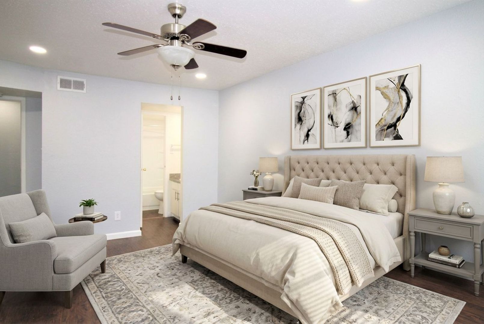 This two-bedroom townhome apartment features a spacious open-concept layout, a modern kitchen with stainless steel appliances and granite countertops, LED lighting, and a private balcony. Both bedrooms offer wood flooring, ample closet space, and room for a king-size bed, plus washer/dryer connections for added convenience.
